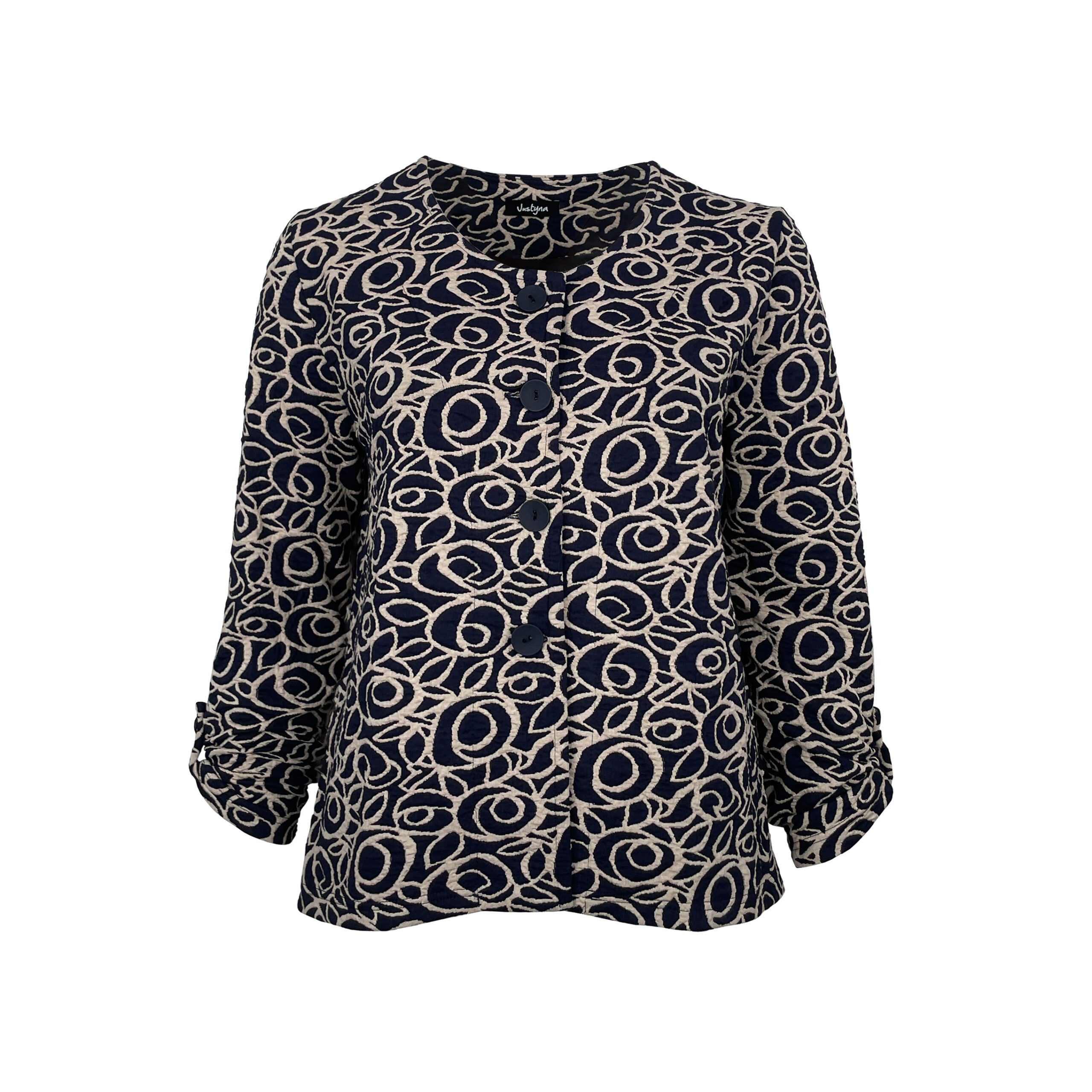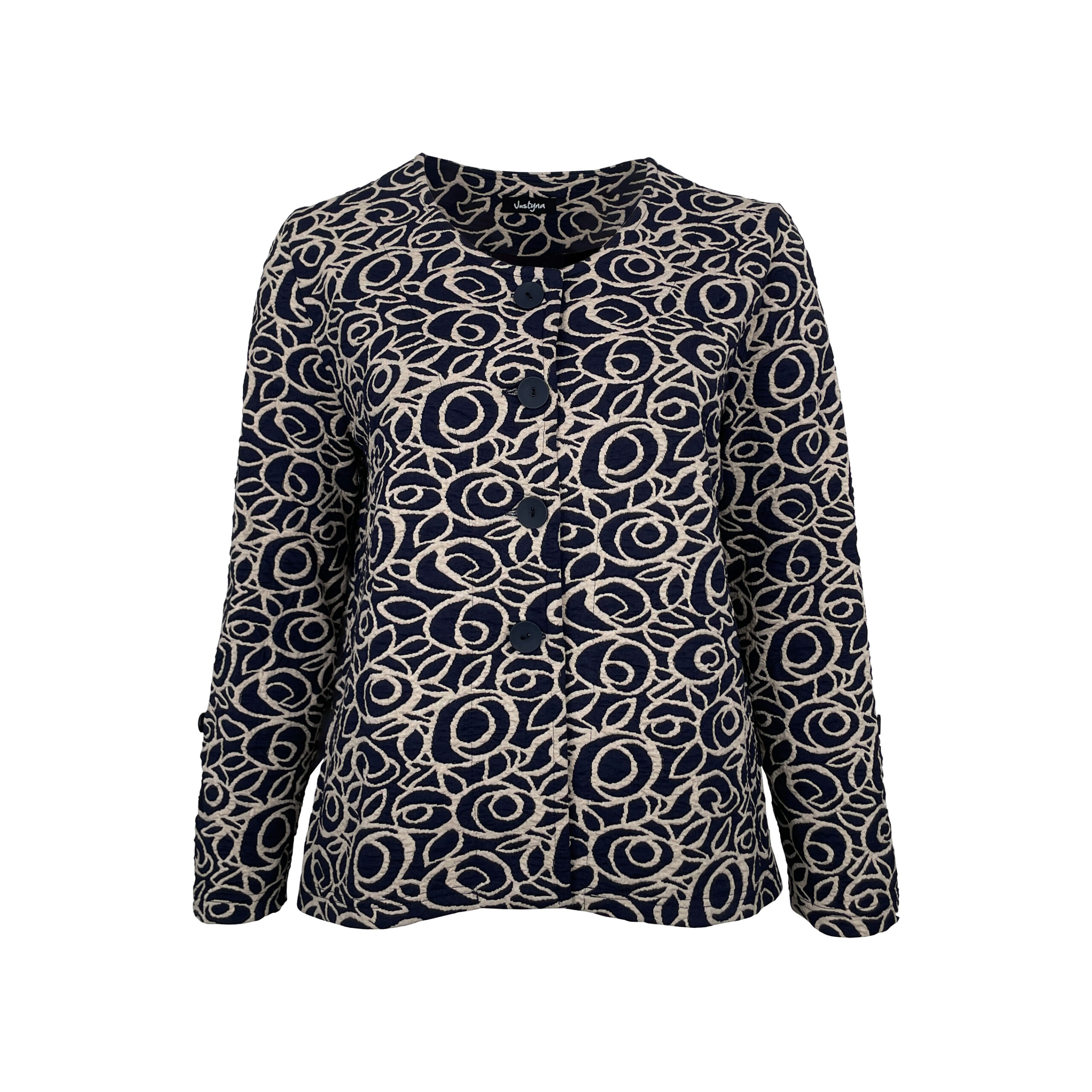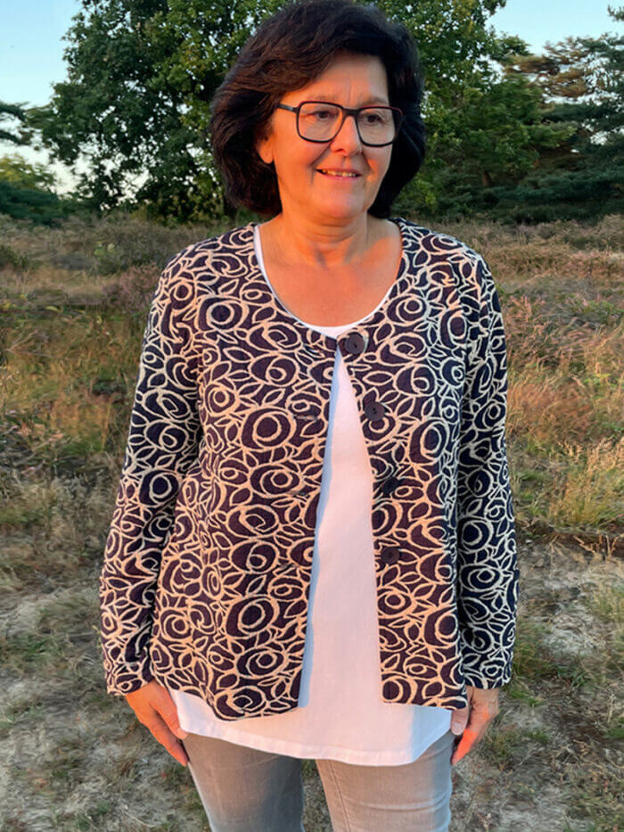 Details: Schlitz am unteren Saum auf der Rückseite. Die Jacke ist vorne kürzer als hinten. An den Ärmeln befindet sich seitlich ein Knopf.